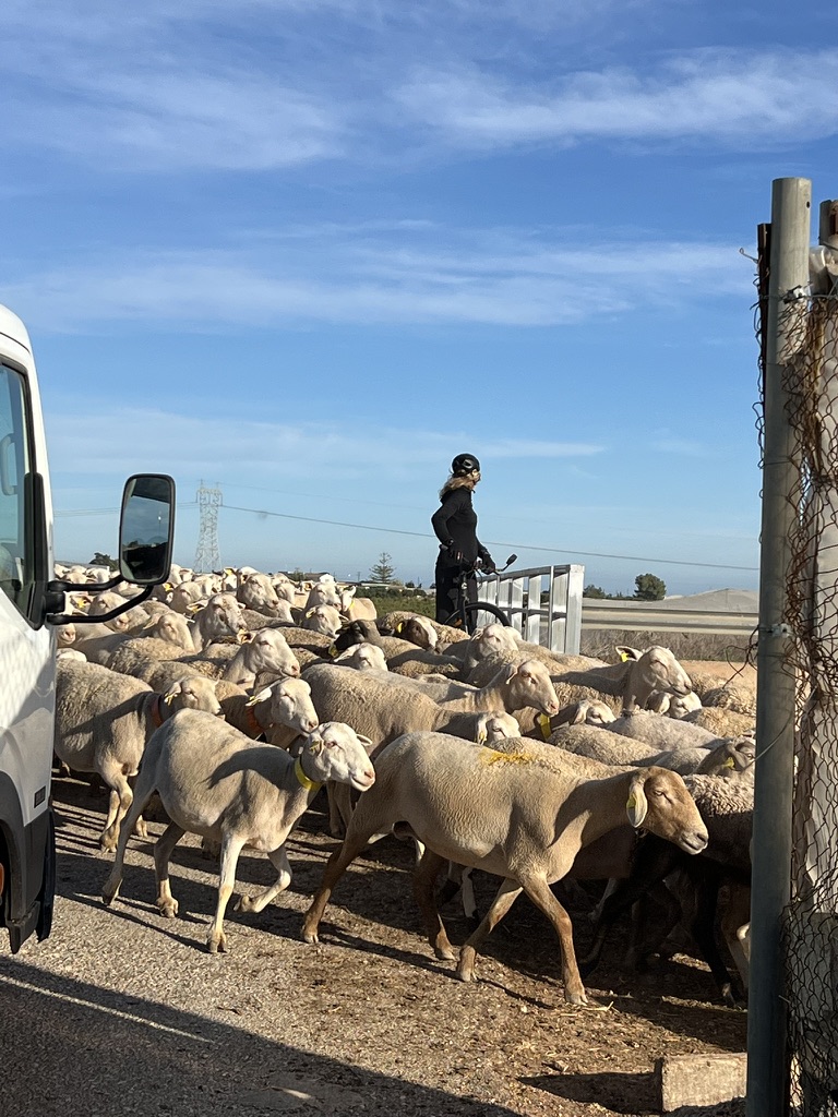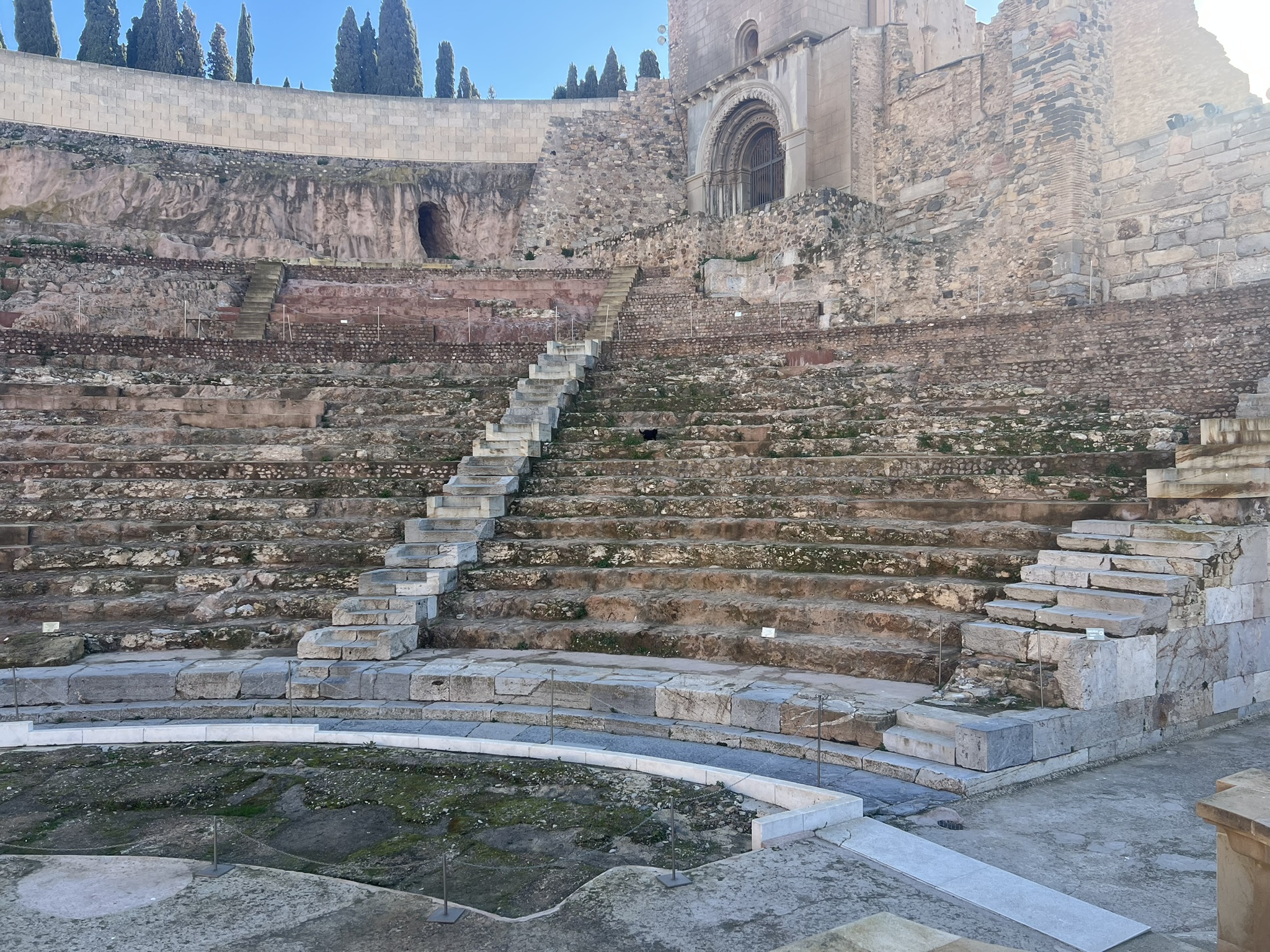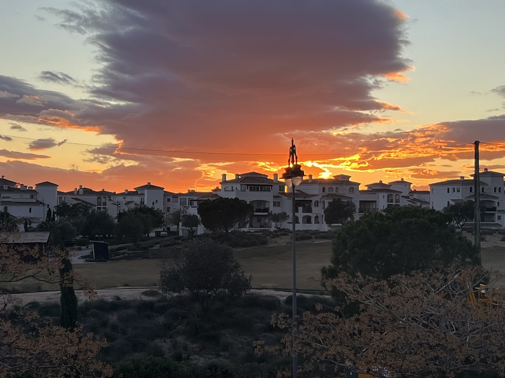 On a bike ride, Lisa and I were somehow separated by this flock as it was being ably shepherded – by a man and mostly his dog – along the path.Lisa with John Pascuzzi during dinner in Murcia. I worked with John at Atmel in San Jose in around 2000. He now works in Malaysia, and his wife’s family is from Murcia. Small world!The forum in Cartagena, the ancient Roman port city about 30 minutes from our flat. The centuries had resulted in this theater being covered with the town, literally, until it was rediscovered in the 1980s and uncovered in the early 2000s. I love Roman ruins!Sunset view from our back balcony over the driving range. No, we don’t use it!