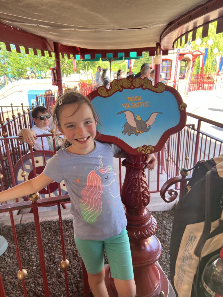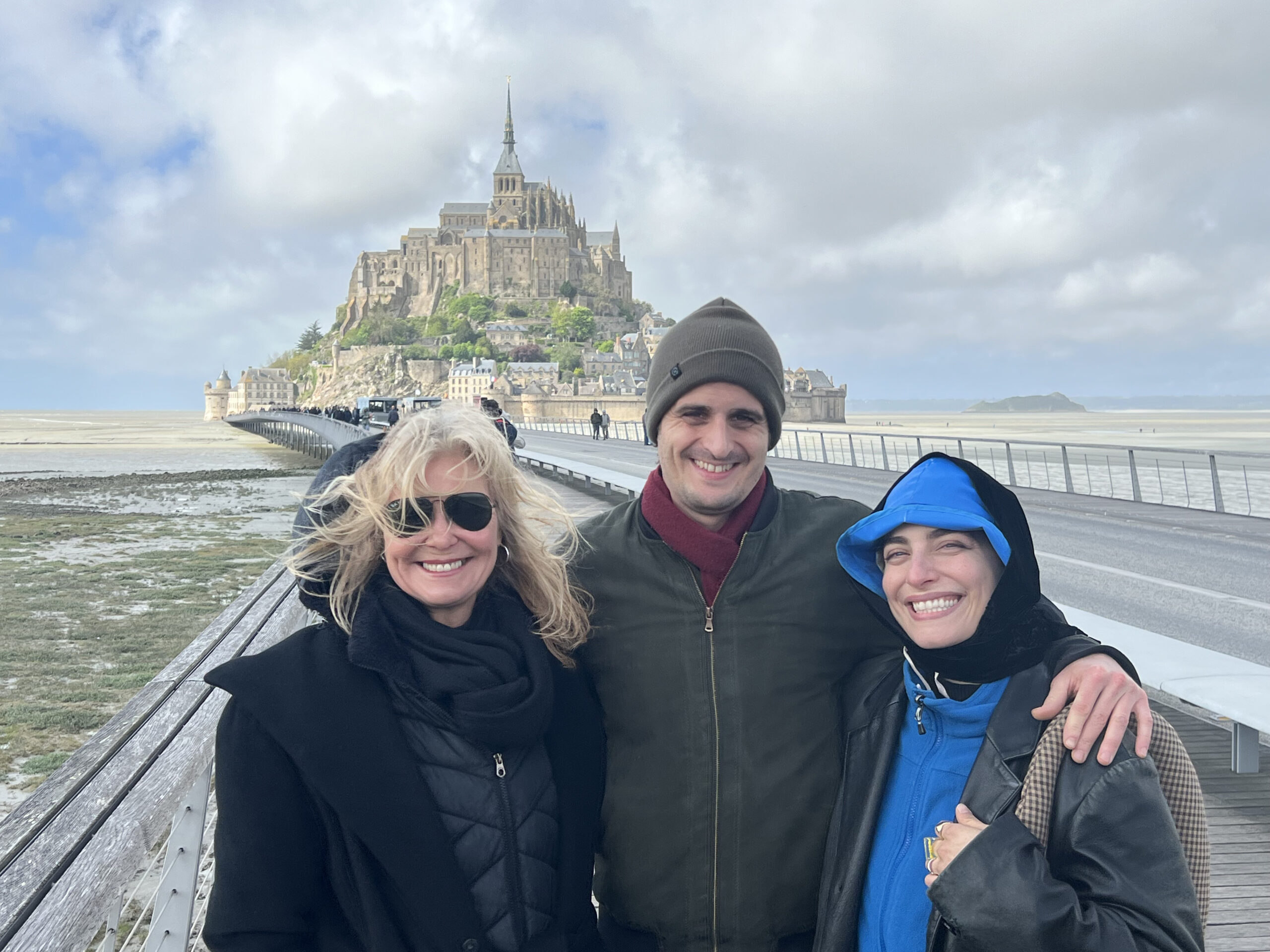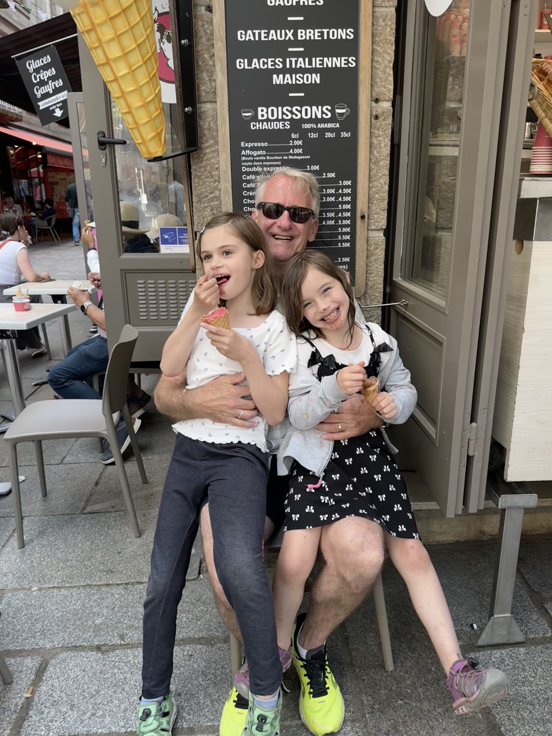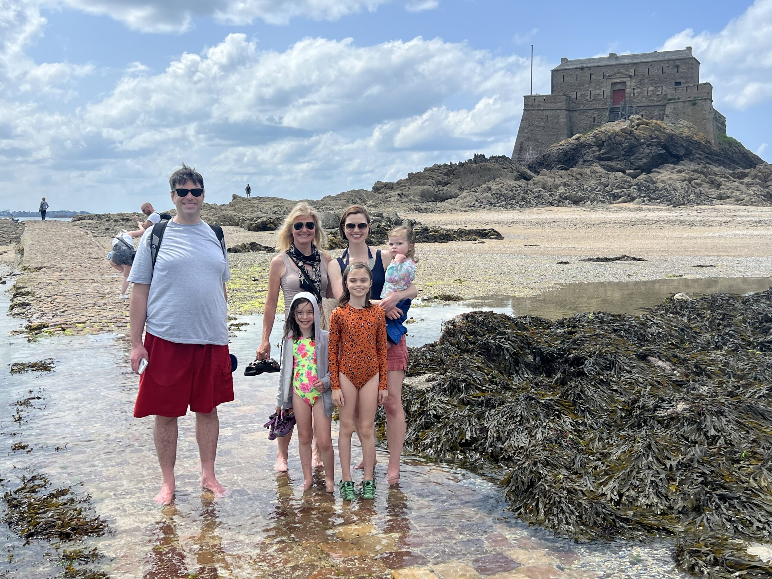 Rosamond in line waiting for the Dumbo ride at Disneyland in Paris.In Dinan with Mabel and Rosamond eating their ice creamMabel at the lunch table in a cafe on Mont Saint MichelLisa with her daughter, son-in-law and the three granddaughters on the beach in Saint-Malo. When the tide is low, you can walk to the old fort on the rocks behind them. Here they are walking back toward the shore with the rising tide already covering a portion of the path.