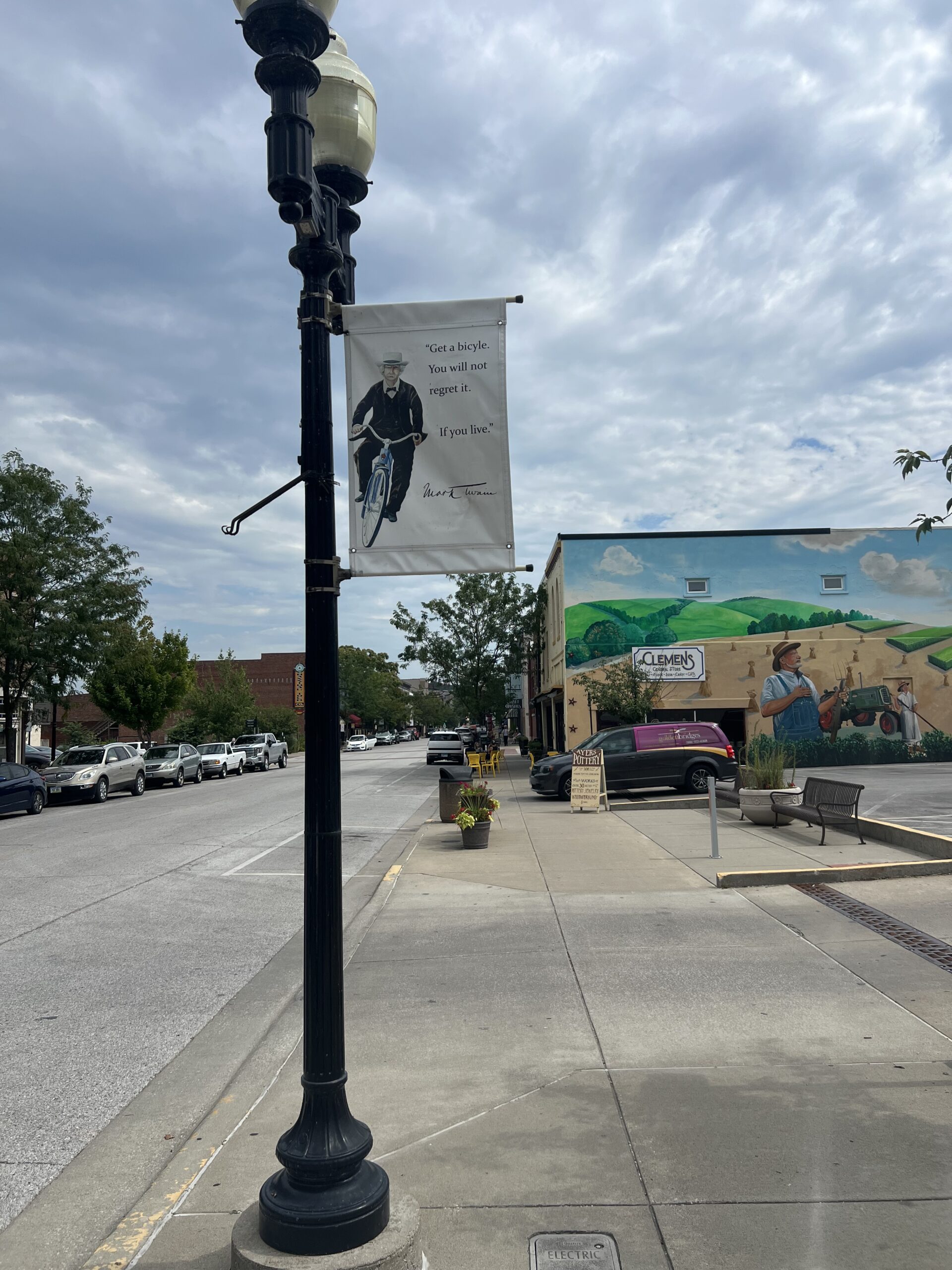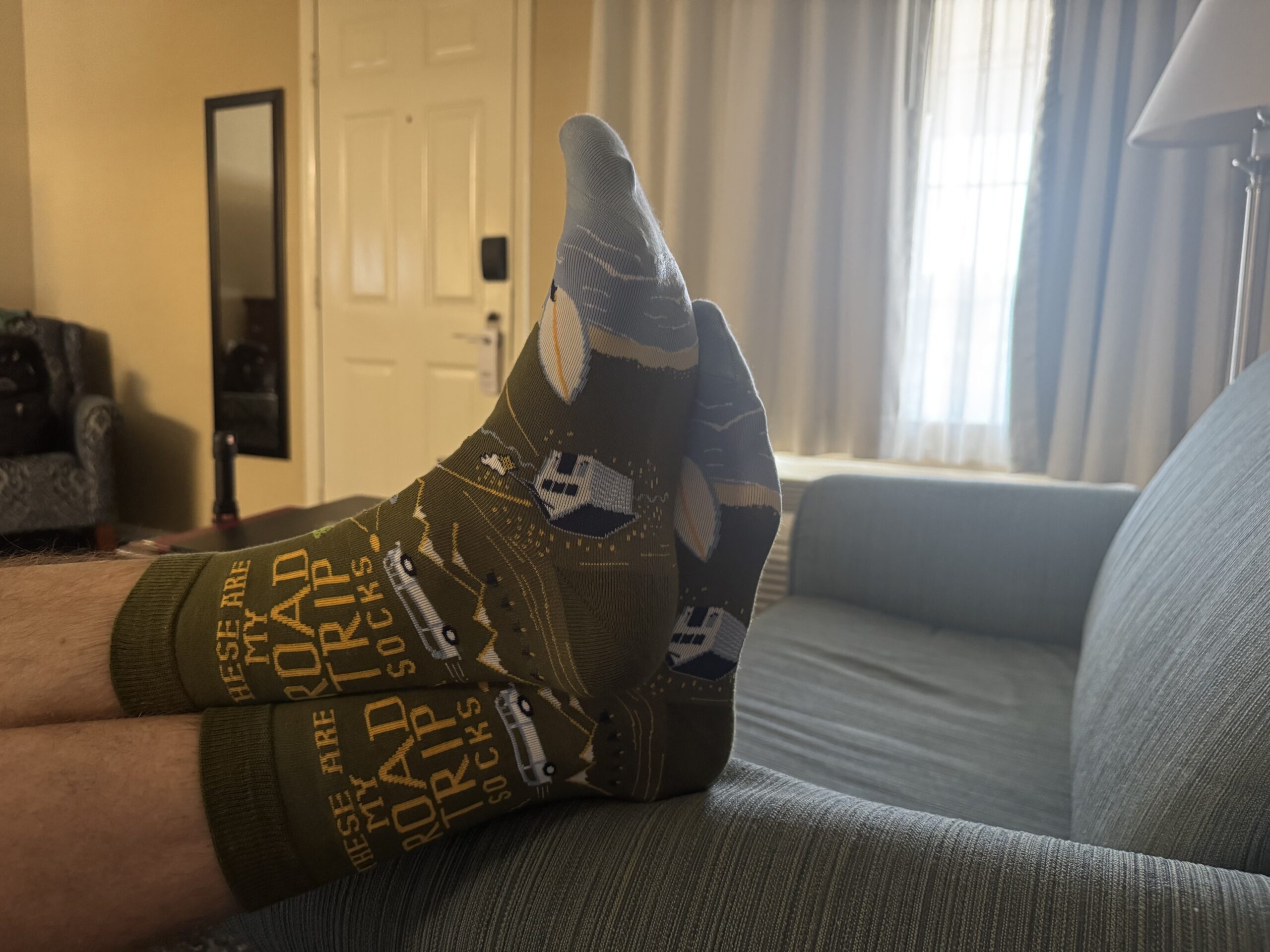 Winnemucca, Nevada, Butch Cassidy’s Saloon, the “Hole in the Wall.” Yep, we’re in the West!On a riverside walk at dusk in Steamboat Springs, Colorado, gateway to Rabbit Ears Pass.The second pass that Lisa and Russ biked over thirty years ago, after Rabbit Ears. They averaged over 100 miles a day. Crazy!And talking of bikes, Mark Twain had this advice, which we saw posted in his home town of Hannibal, Missouri.We traveled with our own Nespresso coffee machine and creamer. Good coffee at a great price!President Dwight D. Eisenhower’s childhood home in Abilene, Kansas. The soldier in charge of D-Day.Graceland shows off many of Elvis’s toys, including this pink 1955 Cadillac Fleetwood, a favorite of his.We discovered Buc-ee’s this trip, with its great ads, monster gas stations and accompanying cafes and stores.Finally, a Buc-ee’s product which I could not resist! (Read the socks!)