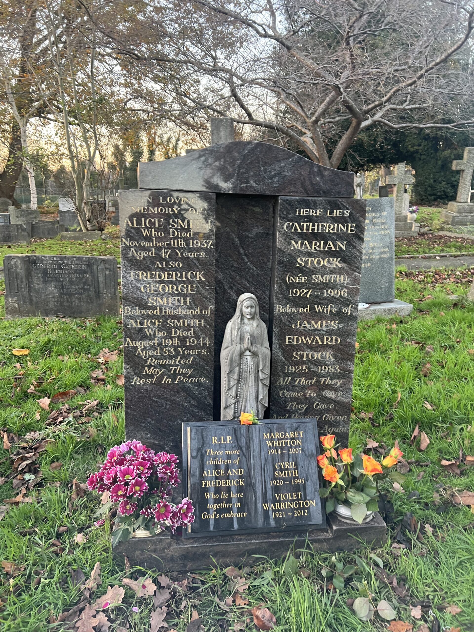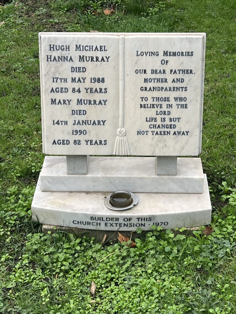 My paternal great grandparents’ grave in Reading, before clean up.And after clean up.Bernie and Leslie Scully near Glastonbury in Somerset. I visited living friends too!Mum and her family’s grave in Erdington, Birmingham, well maintained by cousin Ron Warrington and his son and daughter-in-law, Alec and Sarah.Hugh Murray and his four sons built our Marlow home, where mum lived for thirty years. They built it for themselves before their boys moved out and they sold it to mum and dad. That was in 1966. They are buried in the churchyard of St Peter’s Church, Marlow. Building the church’s extension was the Murrays’ proudest achievement.