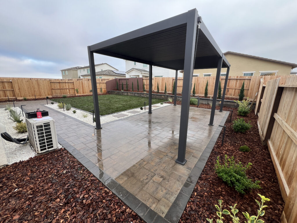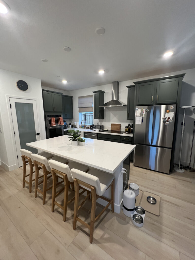 The landscaped back yard, featuring an awning for an outdoor living room / barbecue area and trees already planted to create a more private space.The happy couple in front of their new front door.The kitchen, ready for human and feline action (cats are an important part of this household).Pride of ownership.