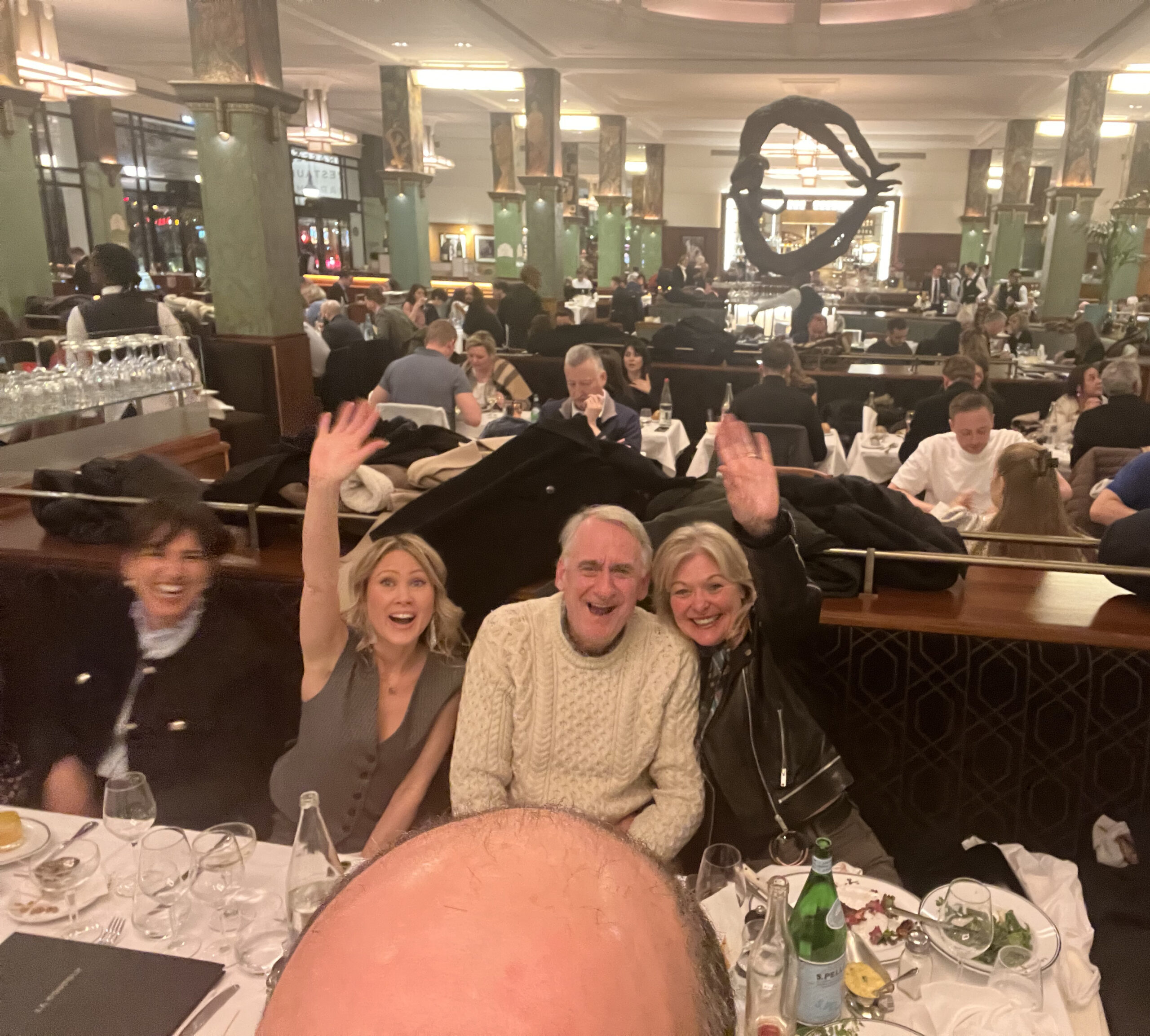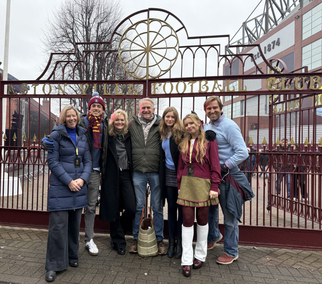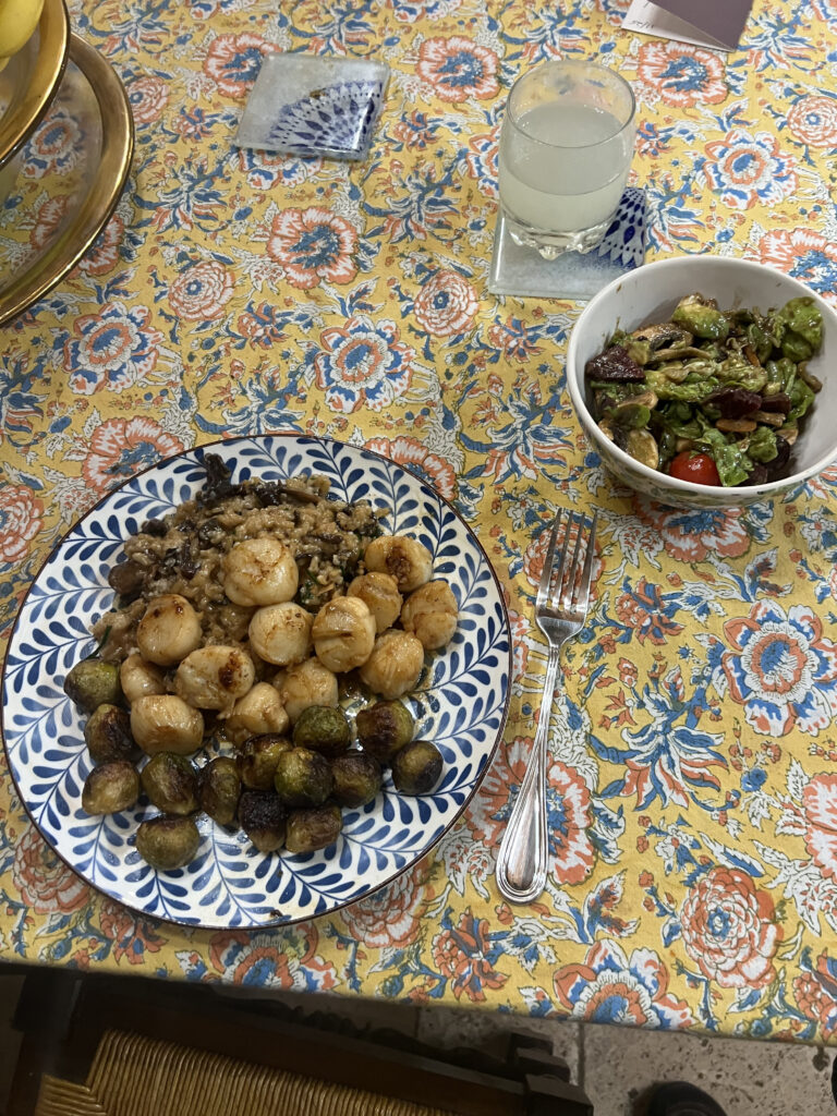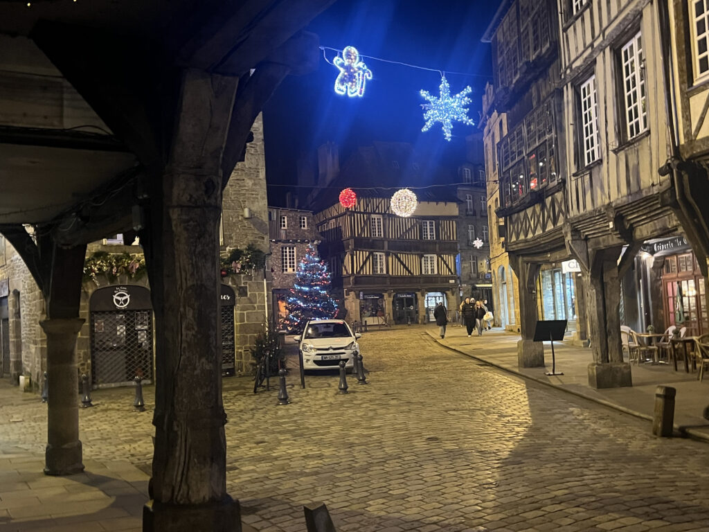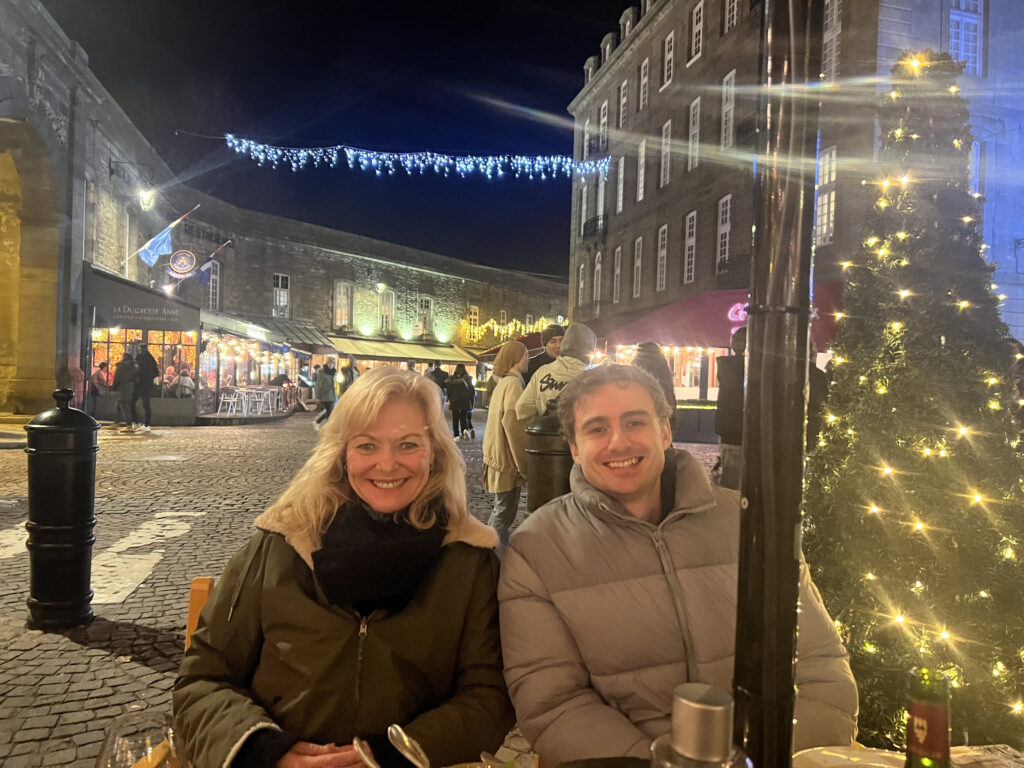 There’s no beating Christmas decor in France. And the medieval buildings in Dinan help!Then there are the Chirstmas windows, here in Printemps on Boulevard Hausmann in Paris.The Dior shop on Avenue Montaigne in Paris, with Lisa by the traffic light!Charlie took a break from his demanding Amazon job in London to visit us for my birthday. Thanks kiddo! Dinner at the Lion d’Or in Saint-Malo.Nothing beats home cooking when Lisa is doing it! Count the scallops!With the Nashes at Villa Park for the Man United game. Don’t ask! Derek was reserving a table for his crew, and Courtney took the pic.Lisa spent two days preparing our Christmas dinner, a triumph which easily overcame the catastrophes! I did most of the clean up, including the catastrophes, delighted to participate despite a complete absence of cooking skills. Linda took the pic on our deck.Linda and Stewart, our Christmas guests, livened up the evening with side dishes, good champagne and a bottle of Châteauneuf-du-Pape. Thanks a bunch, you two!