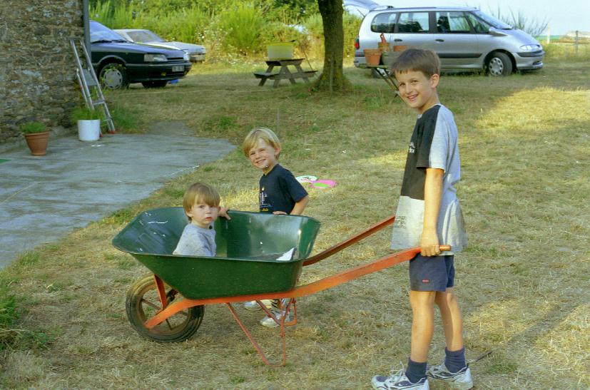 - Tom wheeling his brothers around at La Grée in August 1999. He was bringing them back up from Daniel’s farm, where they’d been checking out the cows and their favorite, Daniel’s tractor. If you look carefully, you can see Marie-Hélène’s silver Rover behind Grandpa’s car. Weeds were growing in it, and it was finally taken to the wrecker.