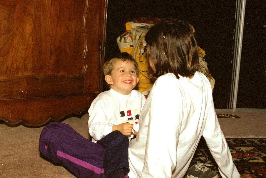 - With Alex in the dining room in our Santa Cruz home, March 2001, when he was three. Look at that love!