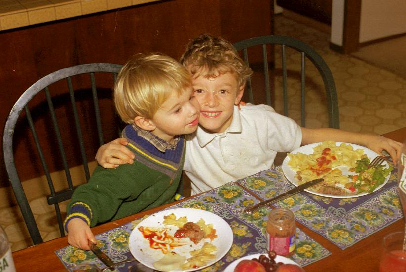 They lived together first from August 1995, when Charlie was born, to June 1997, when those of us who could moved to Santa Cruz. Then Tom stayed in Paris with Nick with their mom until August 1999, when they rejoined us. In the meantime, Alex was born: he was 20 months old before Tom and Nick moved in with him! Charlie barely remembers the two plus years that Tom and Nick did not live with us.