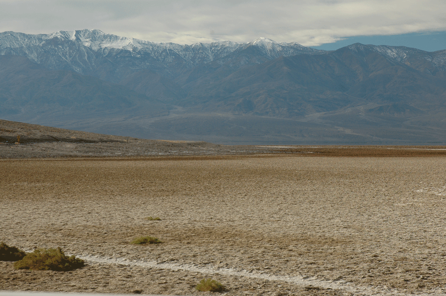 Russ was very surprised to see the water there at all. Notwithstanding its name, he had never seen water in Badwater during any of his earlier visits to Death Valley. Apparently it had rained hard in August, the first storm in 20-odd years, and all the water that had drained into Badwater, forming an impromptu lake, had yet to evaporate. We could see the evaporation which had already occurred in the suspension of colored particles in the shallow pools of water between the crusts of salt, giving them all an odd pastel hue.