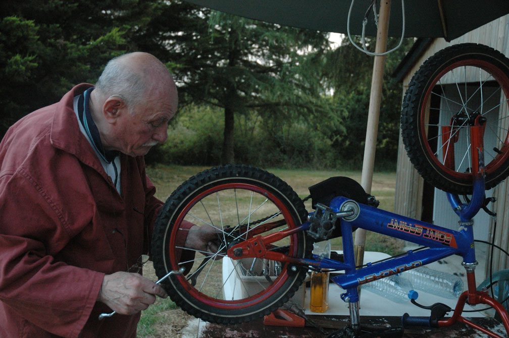 - One summer, grandpere gave both Charlie and Alex bikes which they could use at La Grée, so that they could wander more freely. Here he is in 2006 working on Alex’s for him.