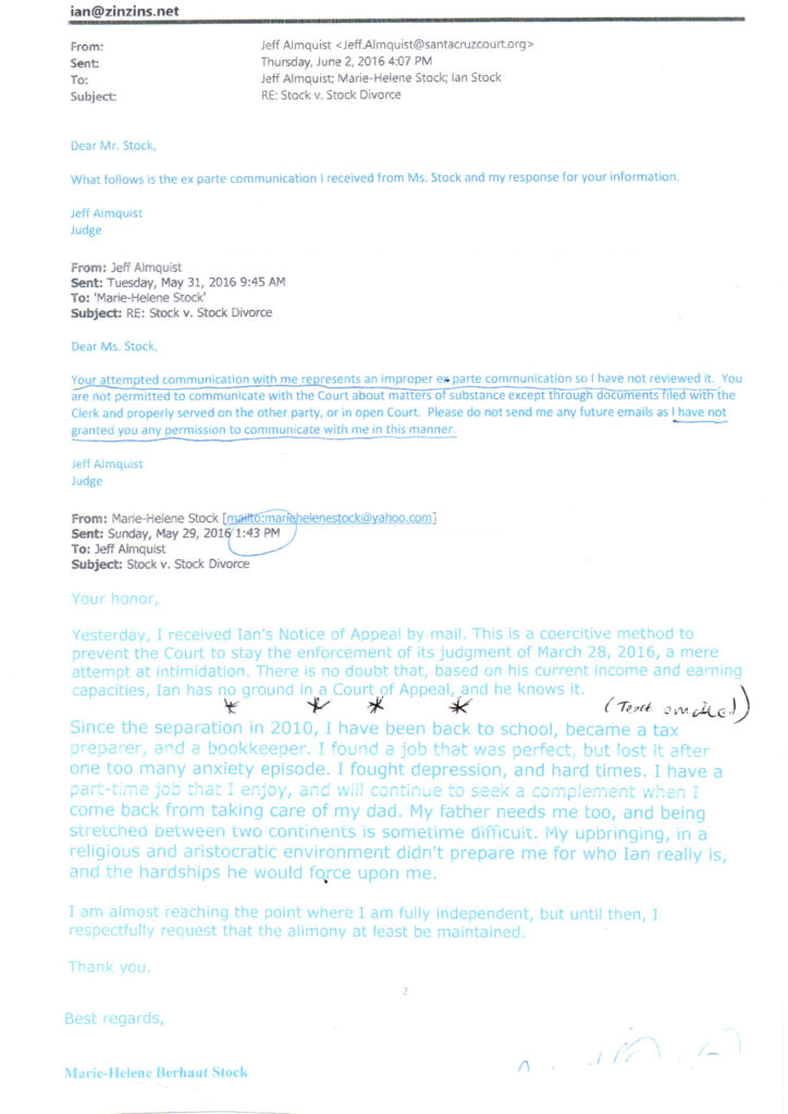 I don’t know if the judge did call Marie-Helene after the trial, or if they had other “friendly” interactions out of the public eye. I do know that she wrote him in 2026 a personal email pleading with him to grant more spousal support, because he forwarded me that email. Was that the only one that she sent him?