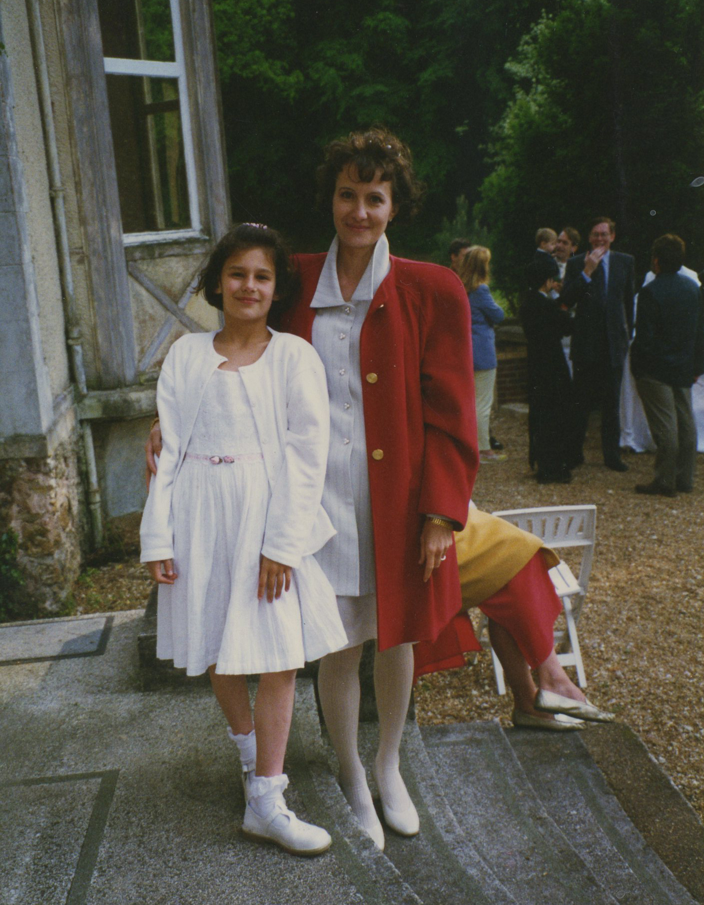 - The bride and her daughter on the front steps at La Bellanderie. Dan Ford faces the camera in the group in the background.