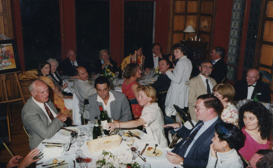 Back at the reception, surrounded by well-wishers. Joce is smiling behind us between Alain, her beau, and Mamie, Marie-Hélène’s grandmother, always full of vim. Uncle Daniel, Mamie’s son, is next to her. In red is Véronique, the bride’s charming cousin from Aix-en-Provence.